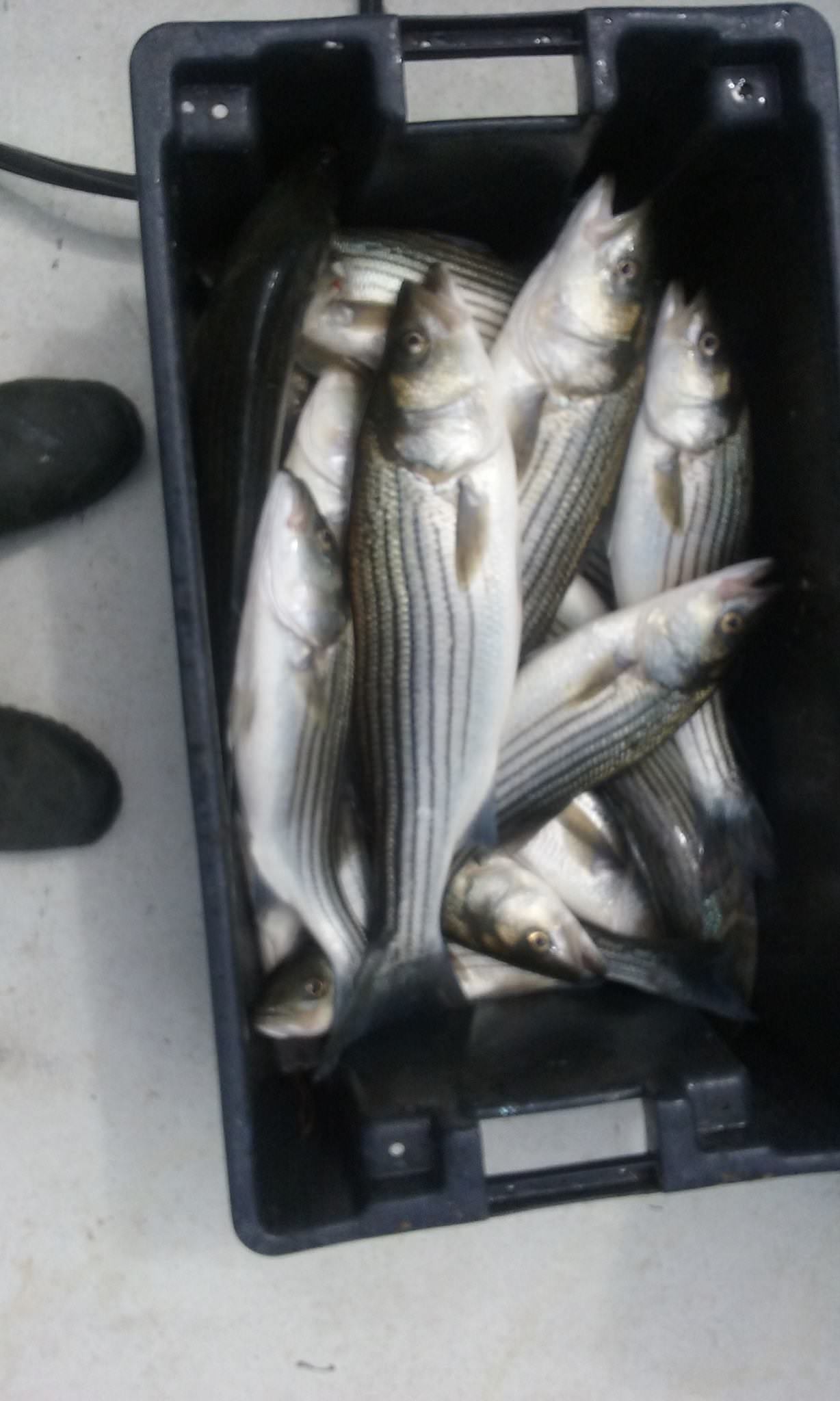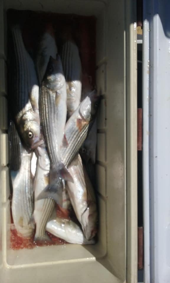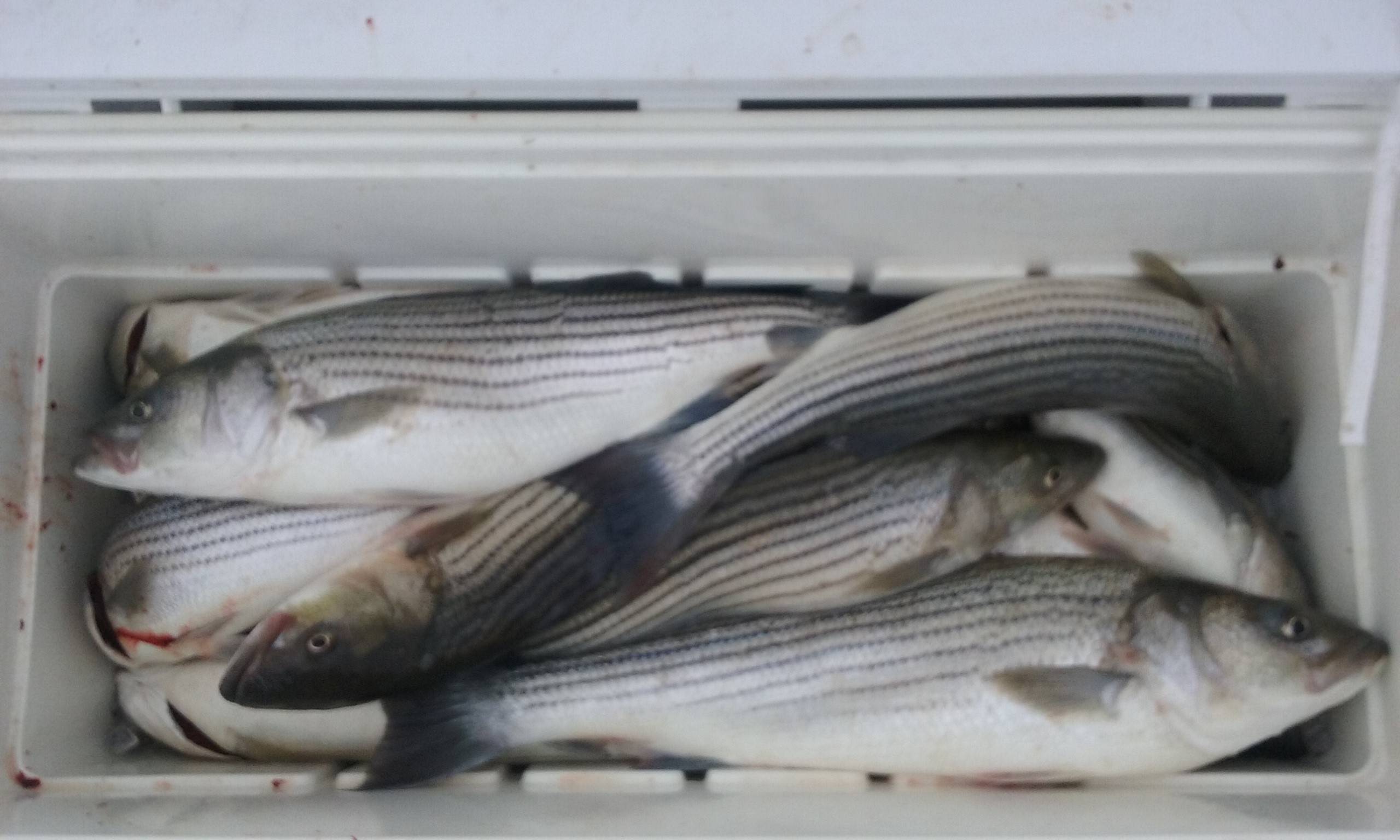The above picture shows the result of our afternoon trip, in which this crew of longtime customers limited out on striped bass! We would see thick clouds of bait fish on the meter, slow down the boat, and get 2-3 hookups at the same time! We started catching fish at 3pm and had our limit by 4pm! It was that fast and furious! A fantastic day!
