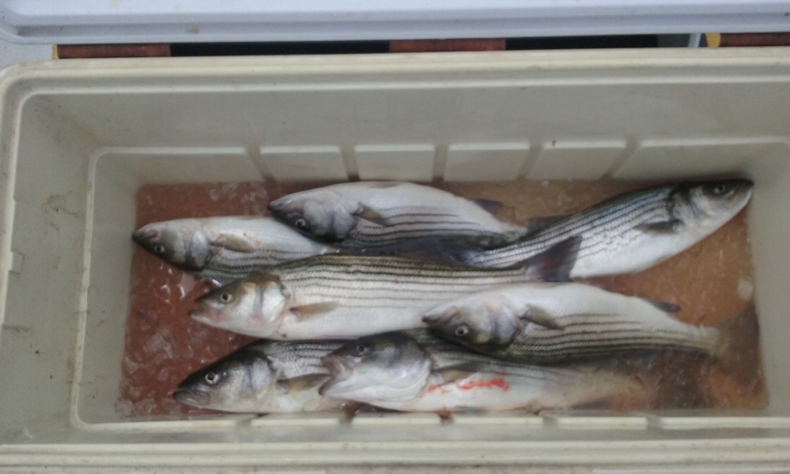 Here, we have another group of happy anglers that fished with us on the Chesapeake! It was an afternoon trip that featured some light tackle action for striped bass. It didn't take long for our group of 13 to limit out on Maryland rockfish! Not all 13 wanted to pose for the picture, but they all caught fish! Just check out the cooler shot below! All of these fish were a healthy grade, ranging from 20 to 26 inches in length!