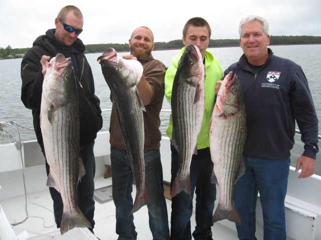 After a few days of slow fishing on Maryland's Chesapeake Bay, it picked up again today! These four guys limited out on rockfish by 7am this morning, and then caught another two big fish as we were getting our lines up for the day! The action was fast and furious on the Chesapeake Bay! These fish were all about 40 inches in length. Another great day of Maryland charter fishing action on the Chesapeake! |